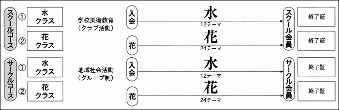 花芸安達流のカリキュラムは、花芸憲章に基づく花芸体系72テーマによって編成されています。自由な選択をと、花芸コースと特定コースに分けました。厳しくも楽しい教室を、全国の正教授会員が研鑚に励んでいます。一輪の花が、必ずや貴方に自然と人間の共存のモラルを伝えてくれる事でしょう。 |
