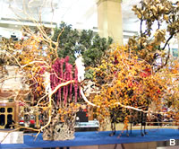 「同じ器、同じ花材を使っても、時間や場所によって異なる表現ができるところに、いけばなの楽しさを感じる」。光、風などのさまざまな条件と周辺の空間を総合的に考えて、「『いま』『ここ』にある」ことに意味のある作品づくりを心がけ、自分らしさを大切にした花を模索していきたいと茜は語る。 |